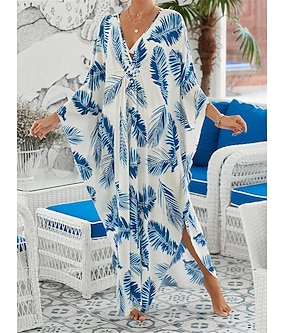 dam täcker grafiskt lövtryck v-ringad lång klänning maxiklänning hawaiian semesterstrand 3/4 lång ärm sommar