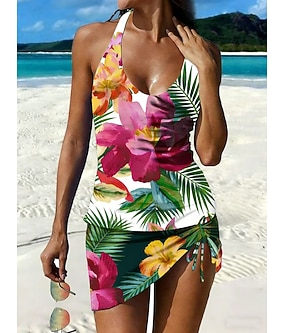 Dam Badkläder Tankini 2 st Kjol Baddräkt Snörning Elegant Semester Blommig Rundhals Ärmlös Baddräkter