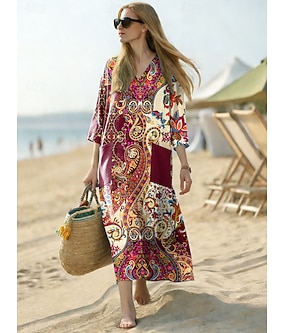 Kvinnors midi-klänning i linneliknande material andningsbar lätt sommarklänning A-linjeformad klänning semester avslappnat boho strand lös passform grafiskt paisleymönster 3/4-lång ärm V-ringning blå
