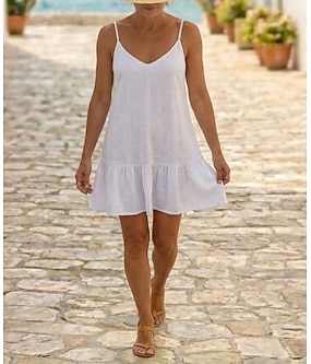 Dam Mini klänning Konstbomullslinne Skiftklänning Solklänning Vit klänning Grundläggande Modern Ledigt Dagligen Helgen Lös passning Slät Ärmlös Smala axelband Vit Gul Grön Sommar Vår