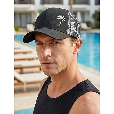 herrkeps i polyester med mesh-patchwork, justerbar truckerkeps i flera färger med broderad palmträd för strandsemester, utomhussporter, resor och vardagskläder