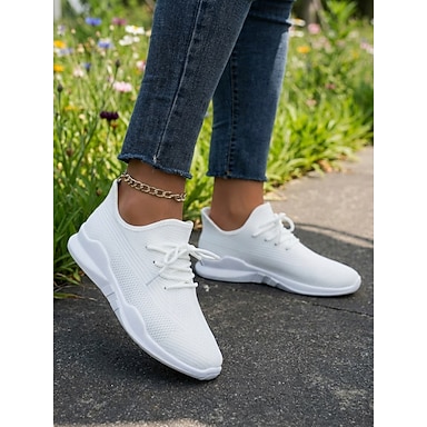 vita stickade sneakers för kvinnor – lätta, andningsbara sportskor med snörning, avslappnade promenadskor för gym, resor och vardagsbruk