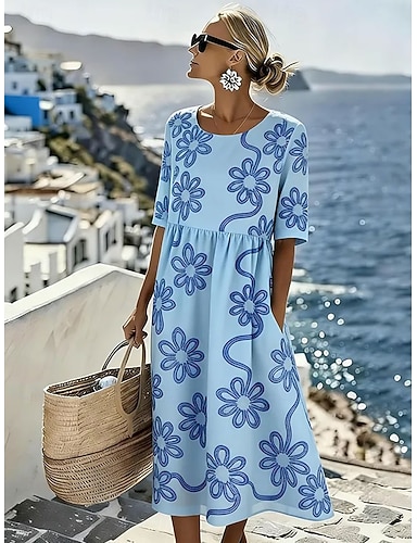Dam Midiklänning Skiftklänning Semester Ledigt Boho Normal Blommig Grafisk Halvlång ärm Rund hals Blå Rodnande Rosa Purpur Grön Sommar Vår