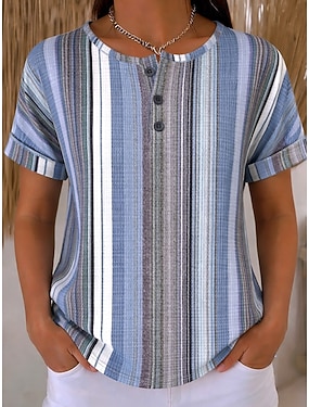 Dam T-shirt Mönster Randig Bröstknappar Rutig Stylish Klassisk Modern Kortärmad Rund hals Henley Vanliga toppar Dagligen Blå Svart Gul Rodnande Rosa Sommar Vår