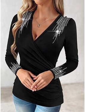 Dam T-tröja Rynkad Tunika Strass Elegant Stylish Sexig Långärmad V-hals Långa toppar Utekväll Festkläder Blå Svart Vin Kaki Grå Vår Höst