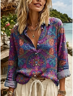 Dam Skjorta Blus Lappverk Knappar Mönster Grafisk Geometrisk Vintage Tropisk Stylish Långärmad Tröjkrage Vanliga toppar Dagligen Blå Purpur Grön Grå Sommar Vår Höst Vinter
