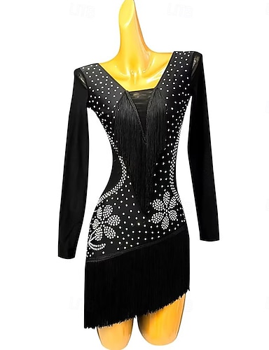 dans salsa latinsk dansklänning strass fransad tofs dam prestationsträning långärmad hög spandex tyll