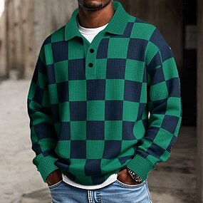 Herr Rutig Färgblock Polo Strukturerad Långärmad Polotröjor Kavajslag Ledigt Skola Fritids- Dagliga kläder 3D-utskrift Vår Höst Vinter Blå Brun Grön
