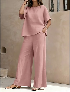15% linne dambyxor linne set grundläggande ren färg ficka resår i midjan t-shirt byxor vardag gata långärmad rund hals blå svart vit marinblå ljusbrun sommar vår