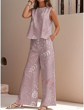 Dam Byxuppsättningar Konstbomullslinne Ärmlös Rund hals Blommig Mönster Aktiv Mode Dagligen Semester Helgdag Rodnande Rosa Slå samman Purpur Sommar Normal