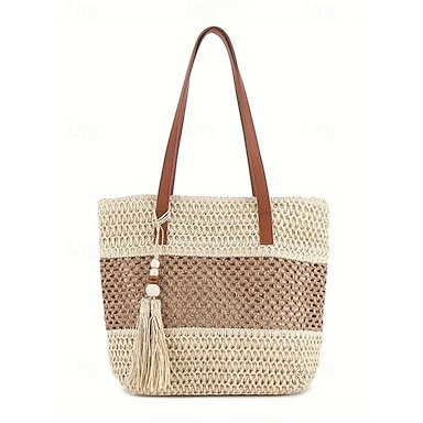 Damväska i vävd strå, stor kapacitet med tofshänge, flera färger, snygg och avslappnad strand- och resväska för vardagsnöje product tag