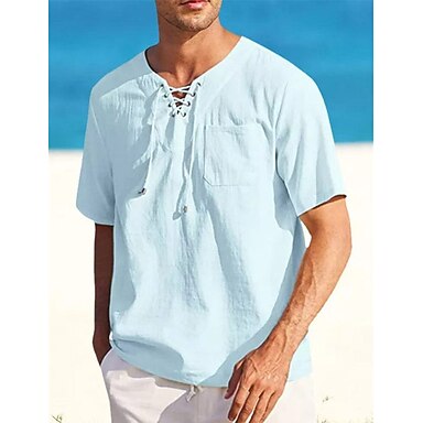 Herr Skjorta linneskjorta Linneskjorta i bomull Sommarskjorta Strandskjorta Slät Semester Ledigt Svart Vit Rodnande Rosa Blå Kortärmad V-hals Sommar Kläder Snörning