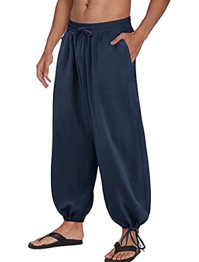 Herr Linne Byxor Långbyxor Sommarbyxor Strandbyxor Snörning Elastisk midja Släpp grenen Slät Komfort Andningsfunktion Utomhus Dagligen Streetwear Linne- / bomullsblandning Stylish Ledigt Svart Blå