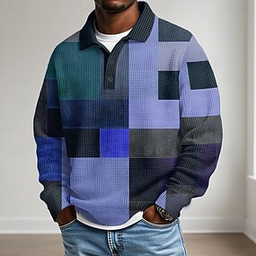 Herr Geometrisk Färgblock Våffelpikétröjor Strukturerad Långärmad Polotröjor Kavajslag Sportkläder Ledigt Skola Fritids- Dagliga kläder 3D-utskrift Höst vinter Blå Brun Grön