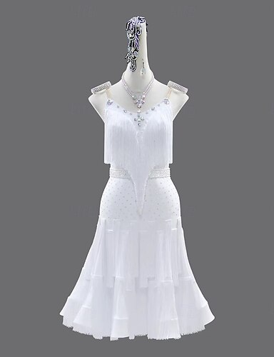Latinamerikansk dansklänning med strass och tofs för kvinnor, festföreställning, ärmlös, salsa, rumba, tävling, scenkläder, kostymer