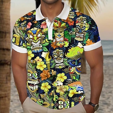 Kentucky Derby Herr Tiki Golftröja Kortärmad Polotröjor Skjortor med krage Ledigt Standkläder Semesterkläder Tropical Wear Festkläder 3D-utskrift Knappar Sommar Gul Rodnande Rosa Purpur
