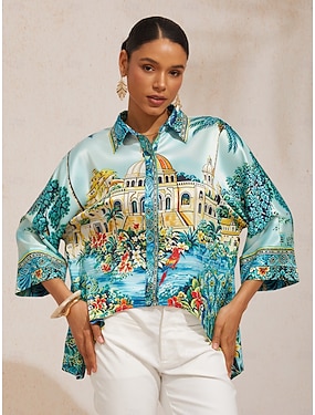 damer satin sidenskjorta svart färgblockstryck 3/4-ärmad skjortkrage semester casual daglig vår sommar höst