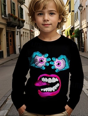 Pojkar tecknat roligt leende ansikte t-shirt långärmad 3D-tryck höst vintermode grundläggande barn 4-12 år rund hals utomhus casual daglig normal passform