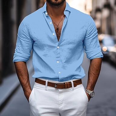 Herr Skjorta Linneskjorta Sommarskjorta Standkläder Knapp upp skjorta Slät Ledigt Dagligen Svart Vit Rodnande Rosa Marinblå Långärmad Nedvikt Vår & sommar Sommar Kläder Slät