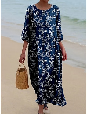 kvinnors vardagsklänning svängklänning blommigt tryck v-ringad lång klänning maxi klänning hawaii avslappnad daglig semester 3/4 lång ärm sommar