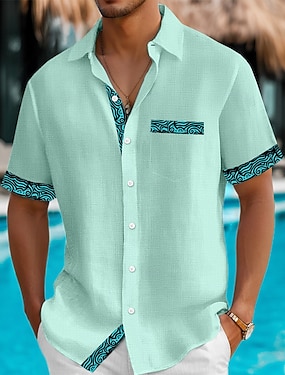 Herr Geometrisk Linneskjorta Hawaii skjorta Knapp upp skjorta Kortärmad Vintage Artistisk Semester Helgdag Standkläder Sommar Vår Nedvikt Färgblock Blå Grön