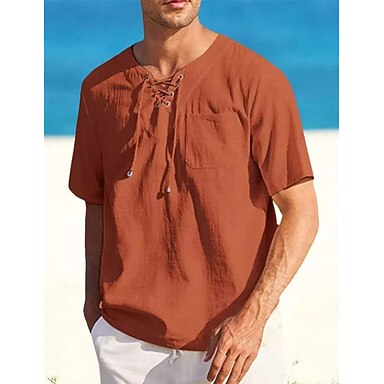 Herr Skjorta linneskjorta Linneskjorta i bomull Sommarskjorta Strandskjorta Slät Semester Ledigt Svart Vit Rodnande Rosa Blå Kortärmad V-hals Sommar Kläder Snörning