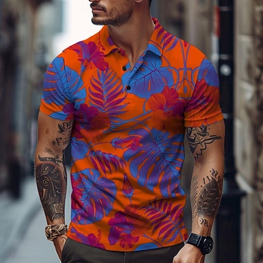 Kentucky Derby Herr Blommig Hawaiian pikétröjor Golftröja Kortärmad Polotröjor Skjortor med krage Ledigt Standkläder Semesterkläder Tropical Wear Festkläder Knappar 3D-utskrift Sommar Purpur Orange
