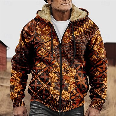 Herr Grafisk Bohemisk Huvtröja Jakke Mode Etnisk Ledigt Långärmad Huva Utomhus Utomhussport Utekväll Ljusbrun Mörk orange Gul Blå Orange Ficka Mönster Fleece Vinter Designer S M L XL 2XL 3XL
