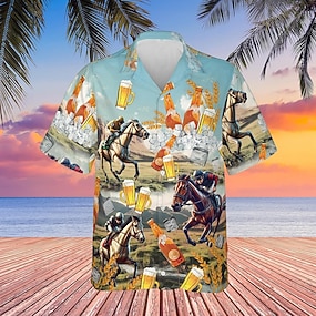 Kentucky Derby Herr Öl Hästkapplöpning Skjorta Kubansk skjorta Kortärmad Vintage retro Semester Helgdag Festival Sommar Vår Lägerkrageskjorta 3D-utskrift Roliga Kentucky Derbyskjortor Ljusblå