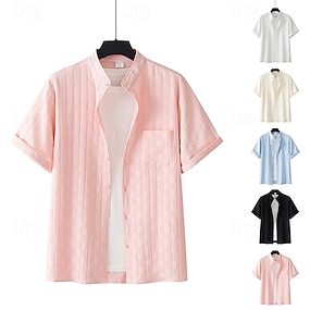 Herr Skjorta Linneskjorta Casual skjorta Knapp upp skjorta Bomullskjorta Slät Semester Gata Svart Vit Marinblå Kaki Kortärmad farfars krage Sommar Kläder Button-Down