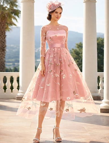 A-linje Knälång Balklänningar Blommig Fe Halvlång ärm Prydd med juveler Trädgårdsfest Bröllopsgäst Tyll med Broderad Applikationsbroderi