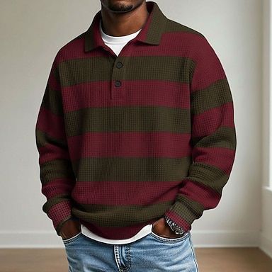 Herr Horisontella Strips Våffelpikétröjor Rugby Polo Rugby pikétröjor Långärmad Polotröjor Skjortor med krage Ledigt Fritids- Dagliga kläder Knappar Vår Höst Vinter Blå Rubinrött Grön
