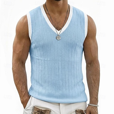 Herr Linne Väst Ärmlös tröja Muskelskjorta Ärmlös V-hals Sommar Vår Slät Mode Klassisk Ledigt Ledigt Strand Gata Blå Vit Topp t-shirt för män