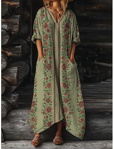 Dam Maxiklänning Boho-klänning Vintage klänning Vardagsklänning Vintage Dagligen Utomhus Semester Normal Grafisk Långärmad V-hals Grön Vår Höst