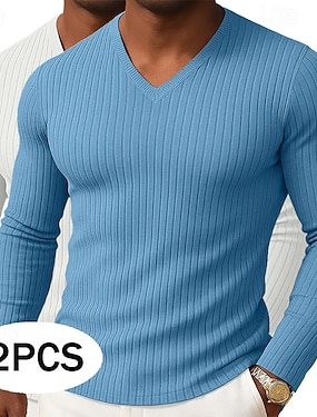 Herr T-shirt Muskelskjorta Ribbstickad t-shirt T-tröja Långärmad V-hals Vår Höst Vinter Slät Pit Strip Mode Designer Grundläggande 2 st Flerpack Stickat Semester Gata Ledigt Blågrå Lila + Blå Svart