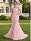 Sjöjungfru trumpet Svepsläp Kvälls klänningar Elegant Ärmlös Enaxlad Bröllop Formell Rosa klänning Chiffong med Veckad