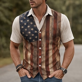 Herr 4 juli USA:s 250-årsjubileum USA: s flagga 2-i-1-vest i konstläder Skjorta Västerländsk skjorta Knapp upp skjorta Kortärmad Patriotisk Helgdag Sommar Vår Nedvikt 3D-utskrift Linne som skjorta