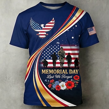 Memorial Day-t-shirt med "Lest We Forget"-motiv för män, patriotisk amerikansk flagga, örn, soldat, heltäckande tryck, rund hals, kortärmad, hyllning till veteran, gåva, designerkläder