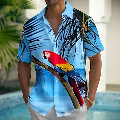 Herr Kokosnötsträd Papegoja Tropiska växter Hawaii skjorta Knapp upp skjorta Aloha skjorta Kortärmad Hawaiisk Ledigt Semester Sommar Vår Nedvikt 3D-utskrift krage skjortor Främre en ficka Bl