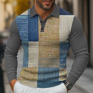Herr Färgblock Våffelpikétröjor Långärmad Polotröjor Skjortor med krage Business Casual Företag Klä till Jobbet Dagliga kläder 3D-utskrift Knappar Vår Höst Vinter Blå Blå 1 blå 3#