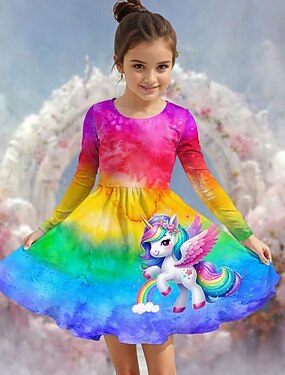 Flickor 3D Regnbåge Klänning Långärmad Sommar Semester Dagligen Helgdag Prinsessa Skön Ljuv Barn 4-12 år Vardagsklänning A linjeklänning Knälång Normal