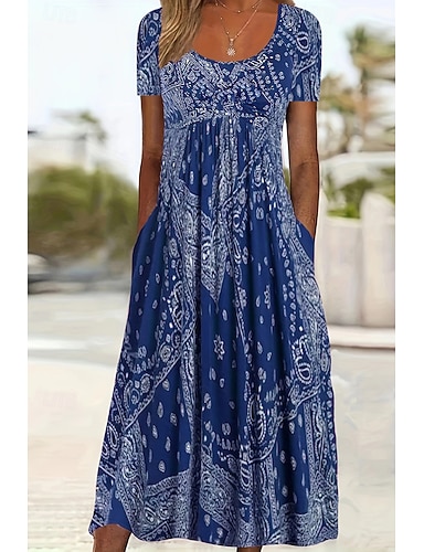 Dam Midiklänning Skiftklänning Semester Ledigt Boho Dagligen Sommarklänning Vårklänning Normal Blommig Grafisk Kortärmad Rund hals V-hals Blå Himmelsblå Mörkblå Sommar Vår