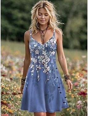 Kvinnors Mini Klänning Boho A-linje Klänning Slip Klänning Semester Casual Strand Utgång Vanlig Passform Blommig Grafik Ärmlös V-ringad Blå Lila Grön Sommar Vår
