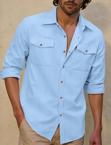 Herr Skjorta Linneskjorta Sommarskjorta Standkläder Knapp upp skjorta Ensfärgat Semester Gata Vit Blå Grön Kaki Långärmad Vik-över krage Sommar Vår Kläder Ficka