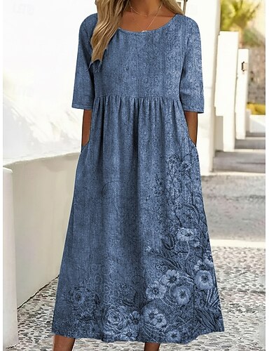 Dam Midiklänning Vardagsklänning Klänning med tryck Vintage Utomhus Semester Utekväll Lös passning Blommig Grafisk Halvlång ärm Rund hals Blå Gul Purpur Grön Sommar Vår