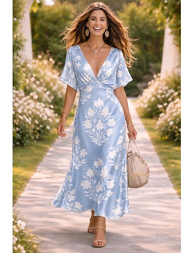 Dam Maxiklänning Vardagsklänning Klänning Set Blommig klänning Slipklänning Elegant Mode Modern Utomhus Semester Utekväll Normal Blommig Långärmad V-hals Blå Sommar Vår