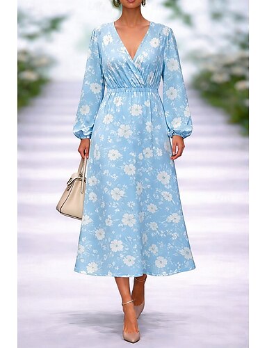 Dam Midiklänning A linjeklänning Fit And Flare Klänning Semester Födelsedag Ledigt Datum Normal Blommig Grafisk Långärmad V-hals Blå Rodnande Rosa Purpur Grön Sommar Vår
