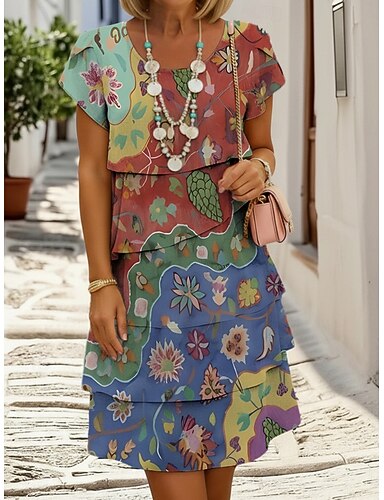 Dam Knälång klänning Skiftklänning Sommarklänning Semester Boho Strandstil Datum Normal Blommig Grafisk Kortärmad Rund hals Blå Rodnande Rosa Vin Orange Sommar Vår