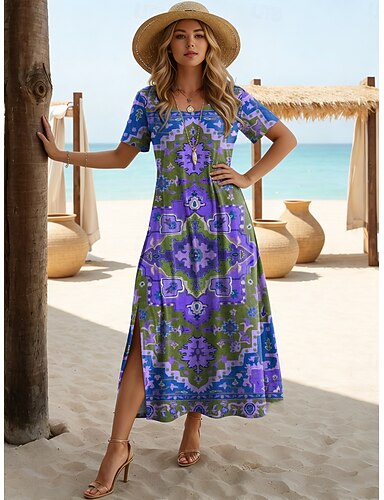 Dam Knälång klänning Boho-klänning Vardagsklänning T shirtklänning Vintage Dagligen Utomhus Semester Normal Nyans Grafisk Kortärmad Rund hals Blå Purpur Grön Sommar Vår