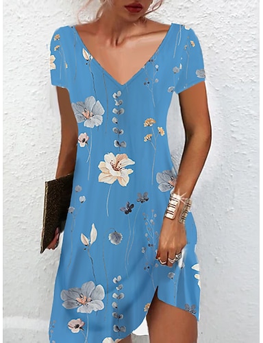 Dam Mini klänning T shirtklänning A linjeklänning Sommarklänning Elegant Semester Ledigt Normal Blommig Grafisk Kortärmad V-hals Blå Rodnande Rosa Purpur Grön Sommar Vår